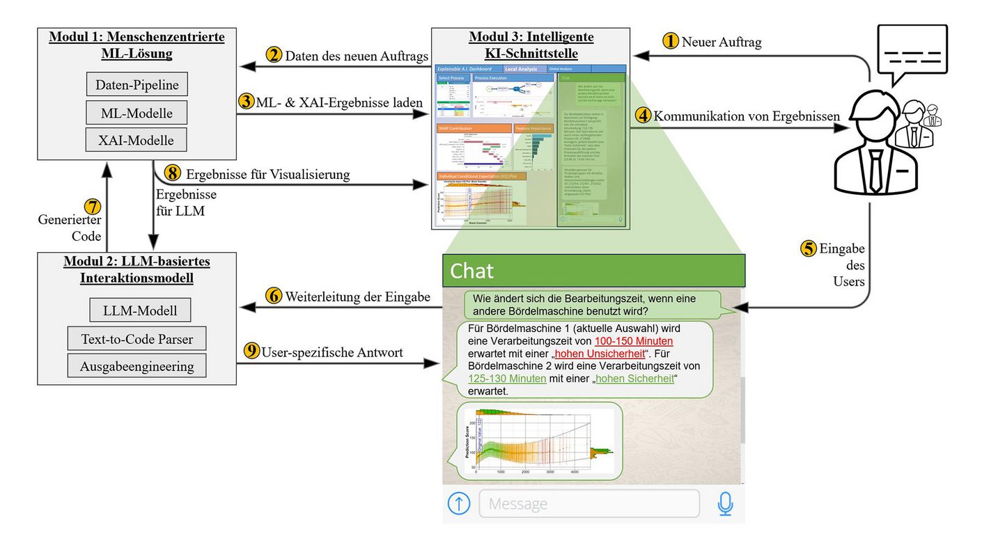 Kern des Ansatzes ist eine agentenbasierte Lösung, die Anwenderinnen und Anwendern eine natürlichsprachliche Interaktion mit den zugrunde liegenden KI-Systemen ermöglicht. Dabei können sie Fragen stellen, Begründungen anfordern, Unsicherheiten analysieren sowie Modellentscheidungen nachvollziehen oder gezielt anpassen. Die entwickelte Architektur ermöglicht es, KI-Systeme in der Prozessplanung und -ausführung nicht nur erklärbar zu machen, sondern aktiv in einen wechselseitigen Dialog einzubinden. Entscheidungen werden transparent diskutierbar, Alternativen vergleichbar und Modelle iterativ optimierbar.
