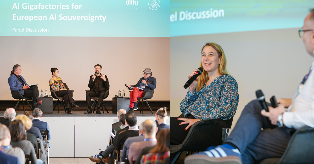 Der 6. November bot einen Blick auf die KI-Infrastruktur in Deutschland, die Arbeit der KI-Servicezentren und die vielversprechenden Perspektiven junger KI-Forschender, sei es in der akademischen Forschung oder als Gründerinnen und Gründer neuer Unternehmen. Dr. Ferri Abolhassan, Vorstandsmitglied Deutsche Telekom AG und DFKI-Aufsichtsratsvorsitzender gab den Impuls für ein Panel über AI-Gigafactories und die Herausforderungen und Chancen für die deutsche und europäische KI-Souveränität. KI-Gigafabriken mit 100.000 GPUs sind zentrale Bausteine für die Entwicklung und Nutzung von KI in Wissenschaft und Wirtschaft. Moderiert von DFKI-Unternehmenssprecher Reinhard Karger diskutierten Mirko Holzer (Bundesagentur für Sprunginnovationen - SPRIND), Prof. Dr. Holger Hoos (Alexander von Humboldt-Professor für Künstliche Intelligenz, RWTH Aachen) und Prof. Dr. Feiyu Xu (German University of Digital Science, Aufsichtsratsmitglied bei Airbus SE, Chain IQ Group AG, ZF Friedrichshafen, Siemens Energy AG) KI-Leuchtturmanwendungen im Gesundheitssystem durch personalisierte Medikamentenentwicklung und bessere Krankenhausverwaltung, im Gründungskontext durch Fokussierung auf Sprunginnovationen, nicht auf inkrementelle Veränderung, bei der Industriellen KI durch die automatische Fabrik und KI für Bürokratieabbau, im Kontext der hybriden Verteidigung durch KI für Cyber-Defense. Das einhellige Plädoyer: Europa muss und kann selbstbestimmt KI-Innovationen entwickeln und die sechs KI-Kompetenzzentren sollten jetzt die Chancen ergreifen, die die EU mit dem AI Continent Action Plan, der Initiative AI for Science und der Apply AI Strategie bei dem European AI in Science Summit in Kopenhagen, 03.-04. November, eröffnet hat.