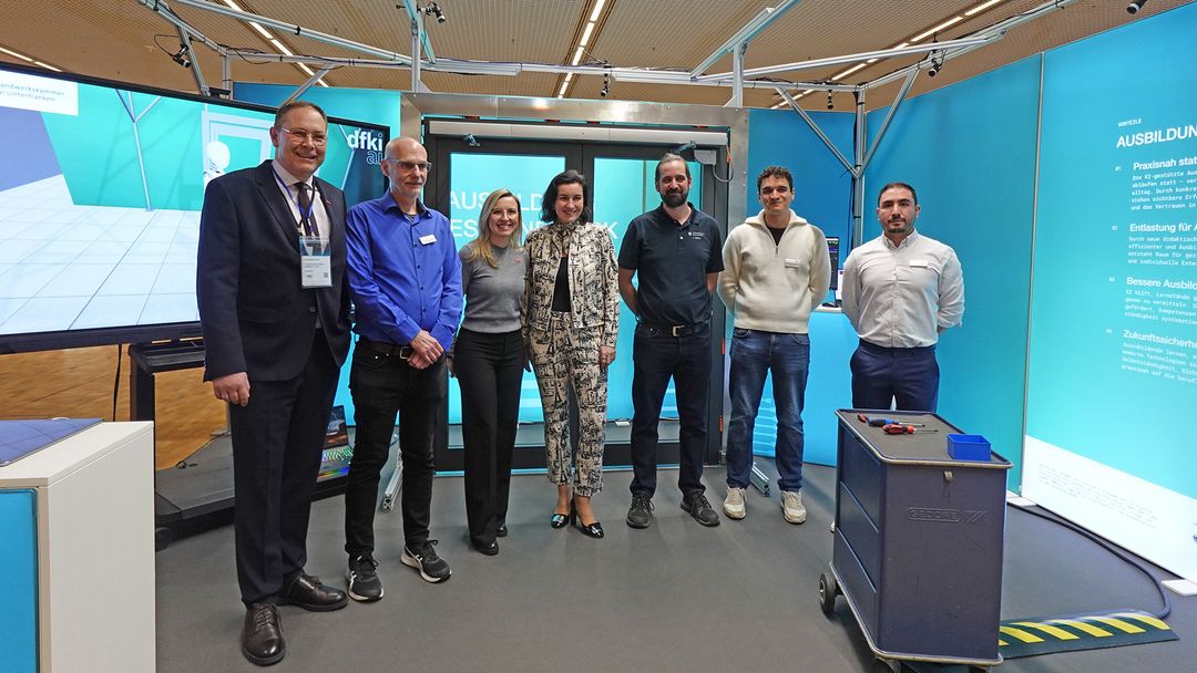 Einblick in ein innovatives Projekt (v. l.): Karl-Sebastian Schulte, Geschäftsführer Zentralverband des Deutschen Handwerks (ZDH), Dr. Tim Schwartz, Deutsches Forschungszentrum für Künstliche Intelligenz (DFKI), Uljana Bauer, stv. Leiterin Bildungszentrum Schweinfurt der Handwerkskammer für Unterfranken, Dorothee Bär, Bundesministerin für Forschung, Technologie und Raumfahrt, Lukas Walter, Bildungszentrum Schweinfurt, Caspar Jacob und Fabio Andres Espinosa Valcarcel, beide DFKI.