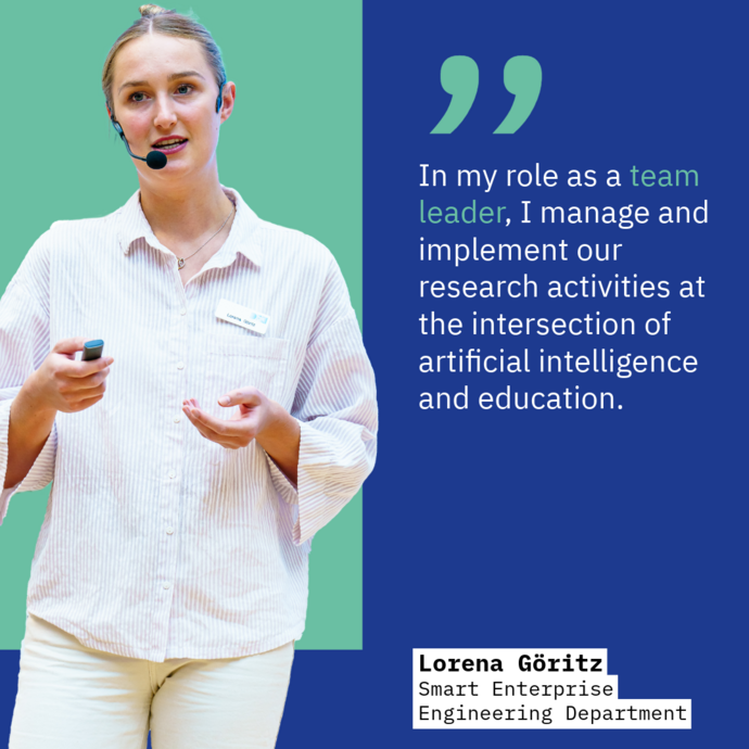 Mein Name ist Lorena Göritz, und ich arbeite seit drei Jahren als Wissenschaftlerin und Teamleiterin am DFKI. Ich habe einen Bachelor-Abschluss in Wirtschaftspsychologie, einen Master-Abschluss in Psychologie und schließe derzeit meine Promotion in Wirtschaftsinformatik ab. In meiner Rolle als Teamleiterin manage und implementiere ich unsere Forschungsaktivitäten an der Schnittstelle zwischen Künstlicher Intelligenz und Bildung.